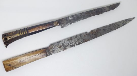 Two medieval bone handled knives, one with brass mounts, 16thC or earlier.