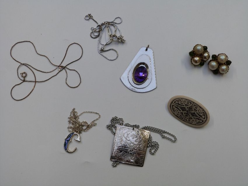 A silver coin necklace, silver and paste necklace, faux pearls, etc