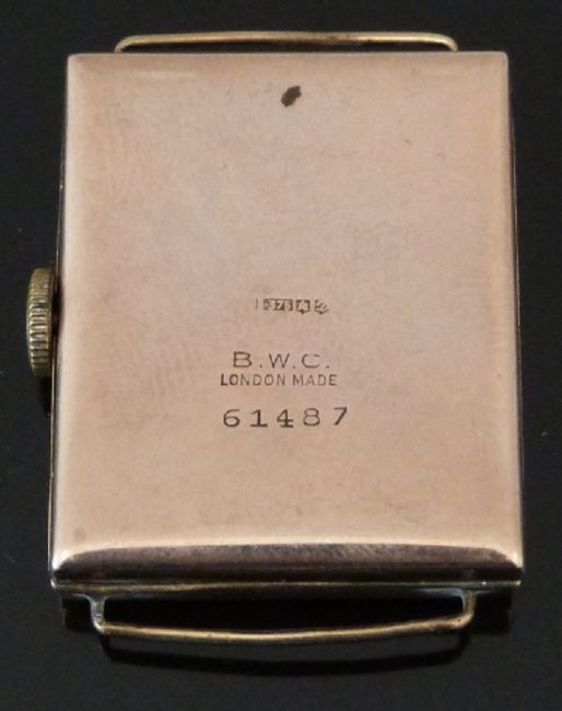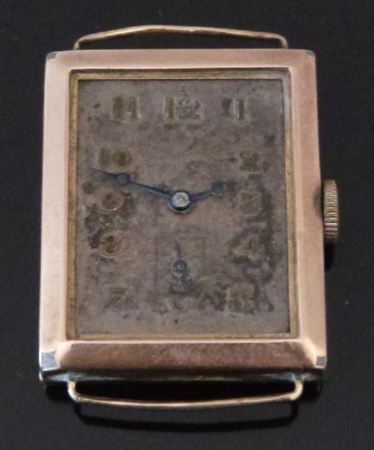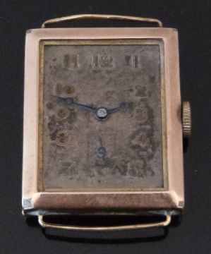 Art Deco style 9ct gold gentleman's wristwatch with subsidiary seconds dial, Arabic numerals, blued hands, silver dial, engraved rectangular case and 15 jewel movement, case diameter 25mm, serial number 61487.