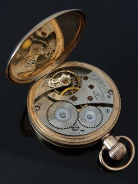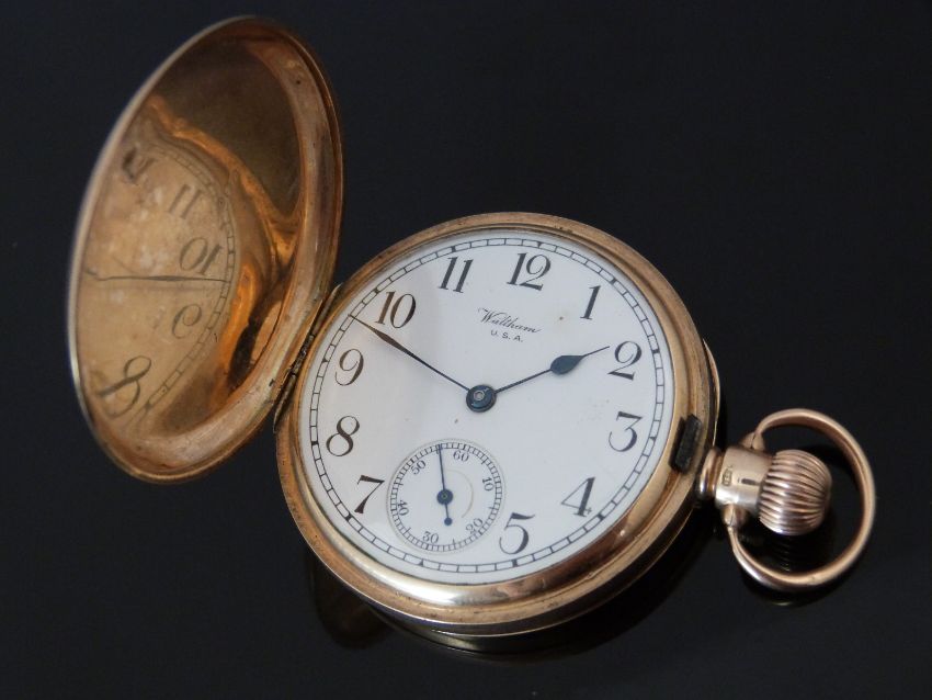 Waltham 9ct gold keyless winding full hunter pocket watch with inset subsidiary seconds dial, blued hands, black Arabic numerals, white enamel face and signed and engraved 17 jewel movement, case diameter 48mm, 88g, serial number 2640011.