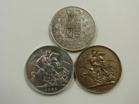 A trio of Victorian crowns comprising young head 1844, VIII with cinquefoils, 1896 LX veiled head, and an 1889 Jubilee example