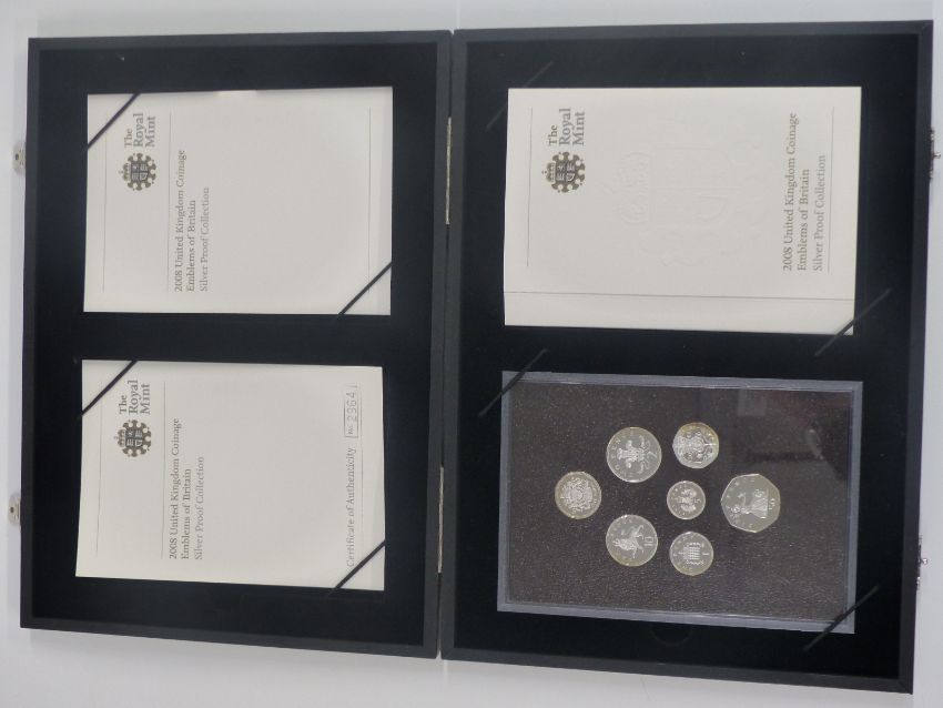 Royal Mint 2008 silver proof collection Emblems of Britain coin set comprising seven coins from one pound to one penny, in original case with certificate