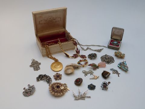 A collection of costume jewellery including bracelets, tiger's eye pendant, Miracle necklace, watches, necklaces, faux pearls etc
