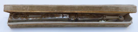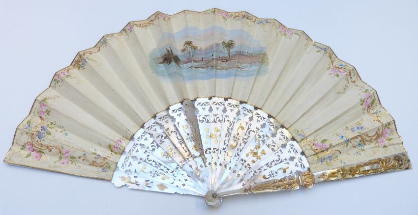 A mother of pearl fan with pierced and gilt decoration and painted scenes, in original velvet covered Duvelleroy box