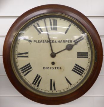 Nineteenth century mahogany cased wall clock by Pleasance and Harper, Bristol, with ivory painted Roman dial with spade hands and single fusee movement.