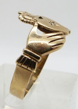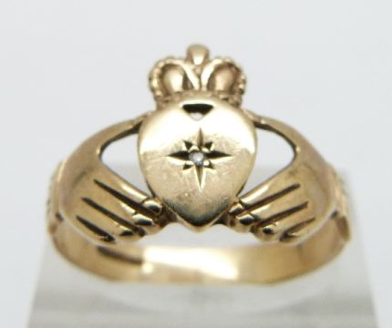 A 9ct gold Claddagh ring set with a diamond , 2.7g, size R