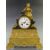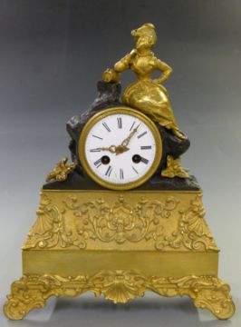 Nineteenth century gilt brass mantel clock with enamel Roman dial, brass filigree hands, French movement striking on a bell, the case surrounded by kilted lady in Tam o'shanter hat leaning on a whisky barrel and sitting on a rock, 35cm tall