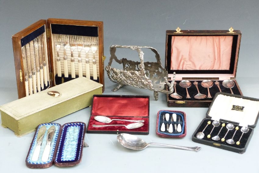 Cased plated cutlery, wine holder, fabric box with portrait miniature to lid etc