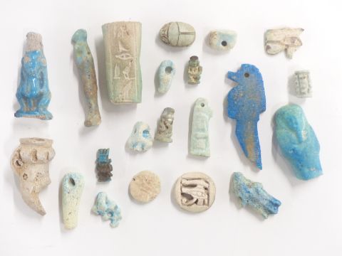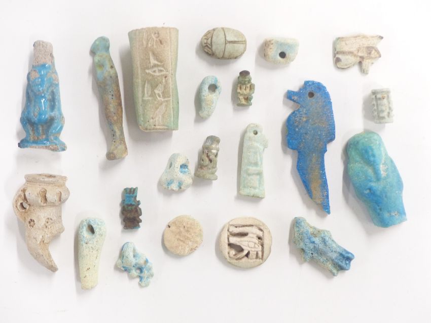 A quantity of Egyptian Shabti figures, amulets, bronze statue part etc