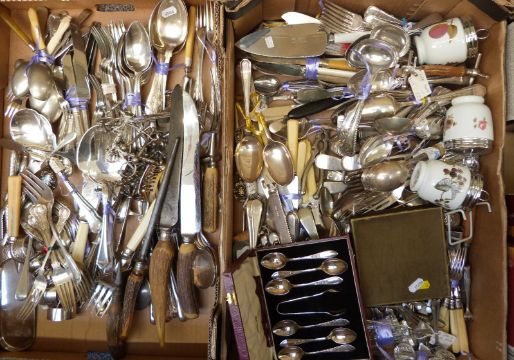 A quantity of silver plated items including King's pattern cutlery, carving knives, knife rests, glassware etc