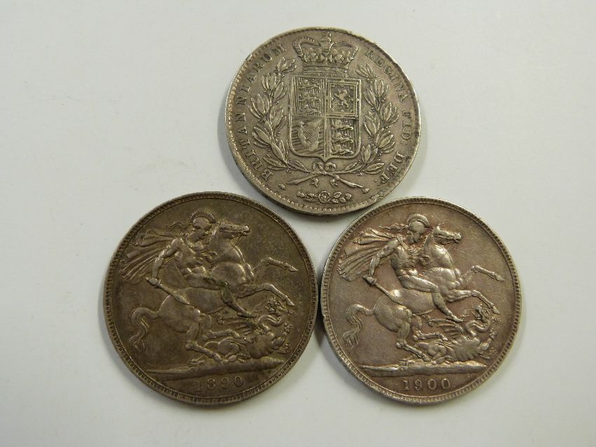 A trio of Victorian crowns to include young head 1844 VIII with star stops, 1900 LXIII veiled head and an 1890 Jubilee example