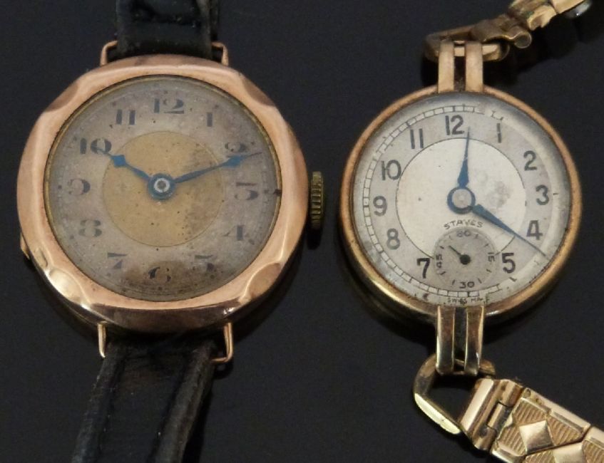 Two 9ct gold ladies wristwatches both with blued hands, two tone faces and black Arabic numerals, one on black leather strap, the other on expanding metal bracelet.