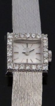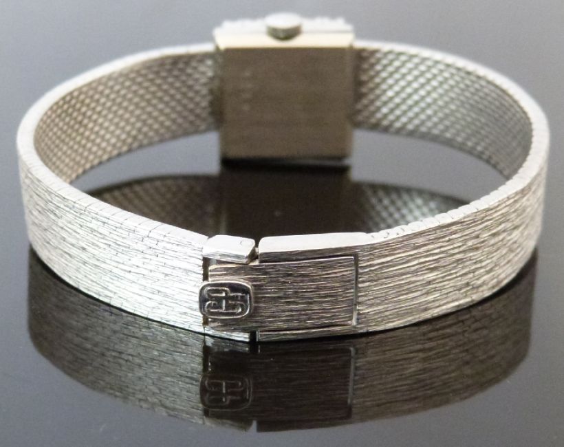 Girard Perregaux 18ct white gold ladies wristwatch with 22 round cut diamonds set to the bezel, baton markers, silver face and signed 17 jewel movement, case diameter 15.2mm, serial number 650202, weight 32.8g in original case with outer box and a copy of the original receipts.