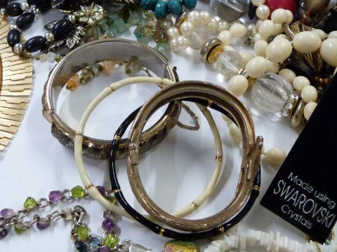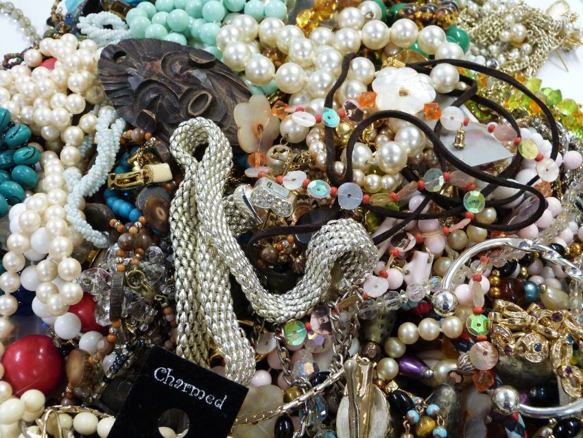 A large collection of costume jewellery including pearl bracelet, silver ring, brooches, necklaces, earrings, Art Deco enamel brooch, etc