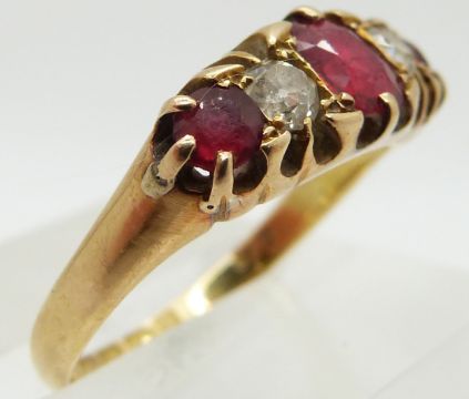 An 18ct gold ring set with two diamonds and red paste,  Birmingham 1890, size N