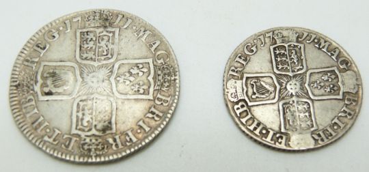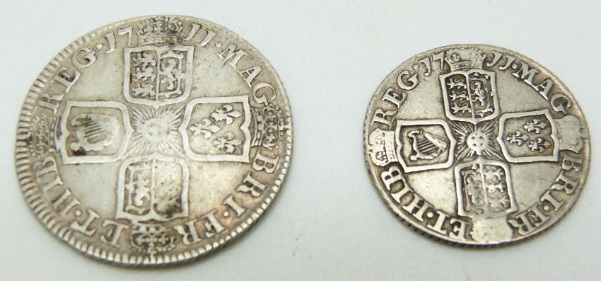 1711 Queen Anne shilling, fourth bust, plain angles, NVF together with a 1711 sixpence, GF