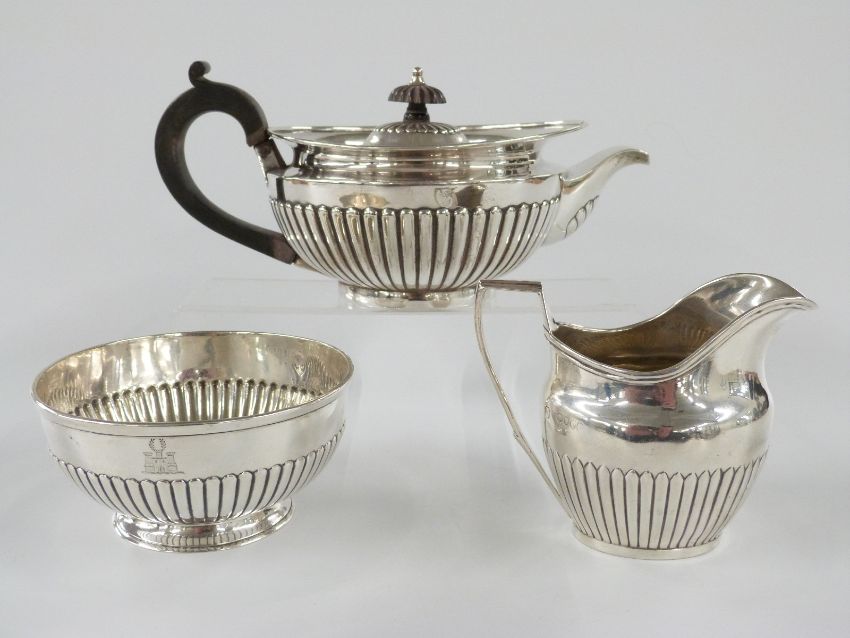 Victorian hallmarked silver tea set of squat lobed form, the boat shaped teapot London 1880, milk jug and sugar bowl 1882, all maker Dobson and Sons, with additional Dobson, Piccadilly impressed mark to all pieces, weight 850g all in