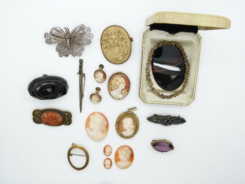 A collection of brooches including two Victorian jet, a Chinese brooch set with agate, lava cameo, etc