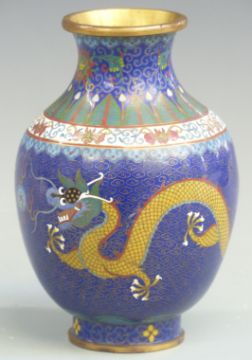 Chinese cloisonné enamel vase decorated with dragons on a blue ground, four character mark to base, 19cm tall