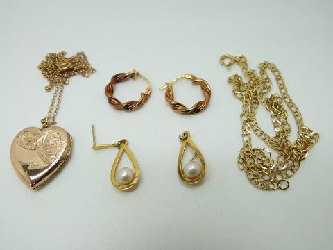 Two 9ct gold chains, two pairs of 9ct gold earrings (7g) and a 9ct gold back and front locket