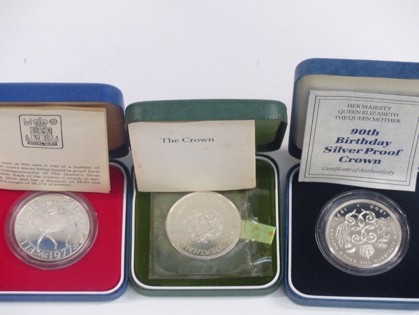 Three cased Royal commemorative silver proof crowns 1972, 1977 and 1990