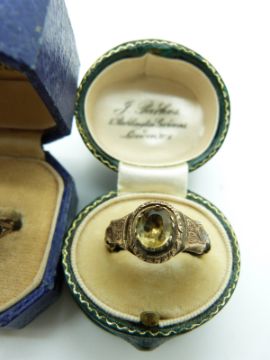 Victorian 9ct gold ring set with a citrine in a foiled setting and another Victorian ring both in vintage boxes