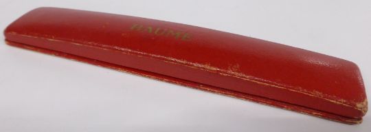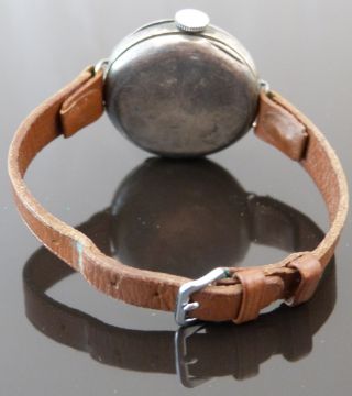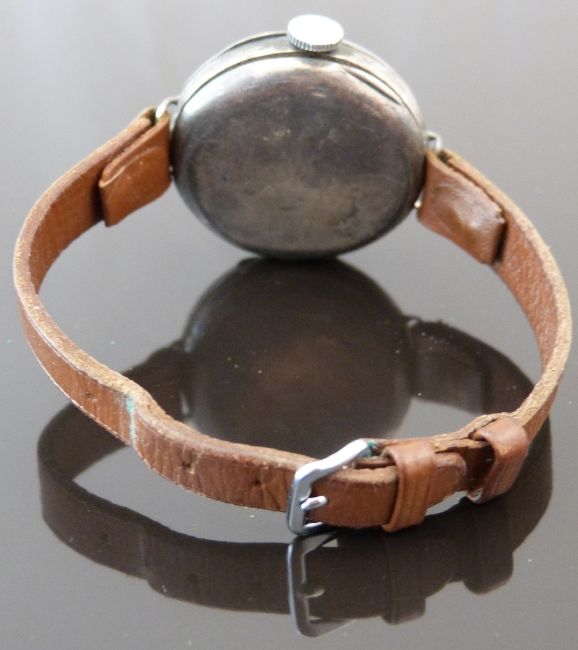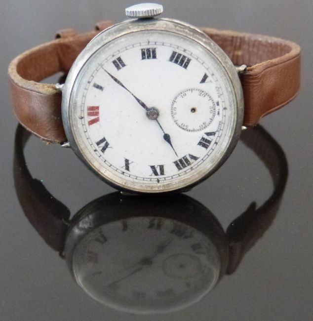 Baume & Co silver gentleman’s military officer's style wristwatch with inset subsidiary seconds dial, black Roman numerals, blued hands, white enamel dial and signed B&Co 15 jewel movement, on brown leather strap, case diameter 33.5mm, serial number 875111