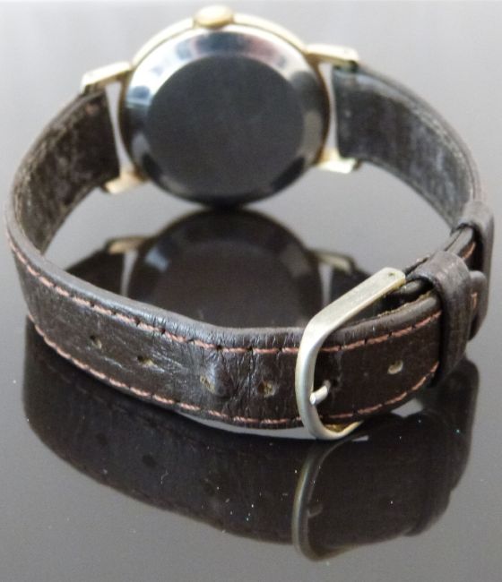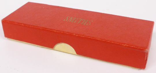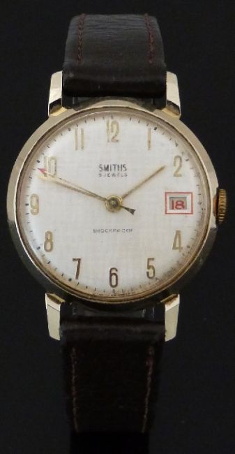 Smiths gold plated gentleman’s wristwatch with date aperture, gold hands and Arabic numerals, red arrow centre seconds hand, patterned face and unsigned movement, on brown leather strap, case diameter 33mm, in original box