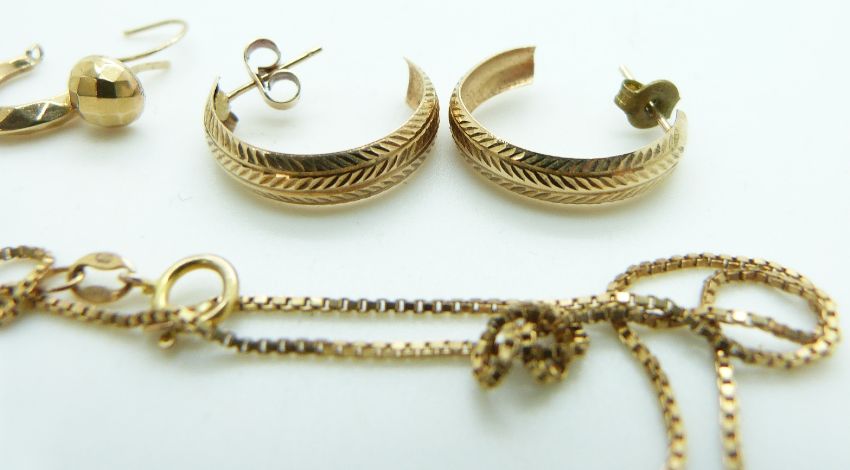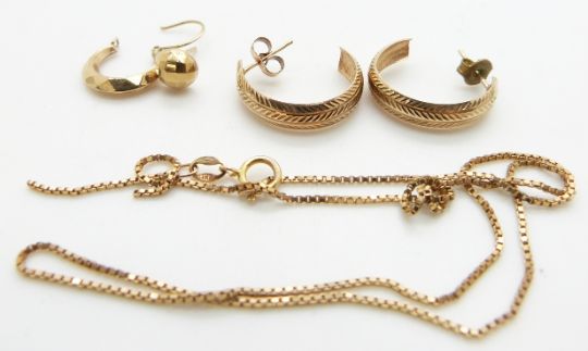 A pair of 9ct gold earrings, a 9ct gold chain and two earrings, 4.1g