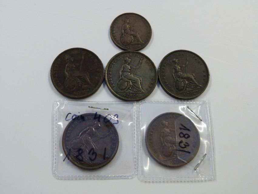 Five 1831 VF William IV copper pennies, no initials, together with a halfpenny with WW to truncation