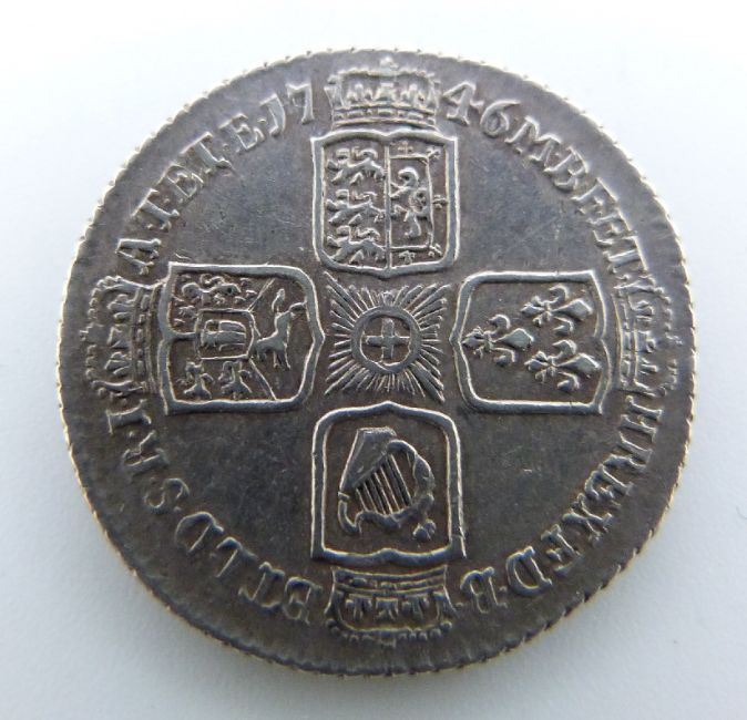 George II 1746 old head sixpence, LIMA below bust, plain angles reverse, seven harp strings, NVF