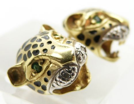 A pair of 18ct gold earrings in the form of leopards, set with emerald eyes, enamel and diamonds