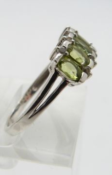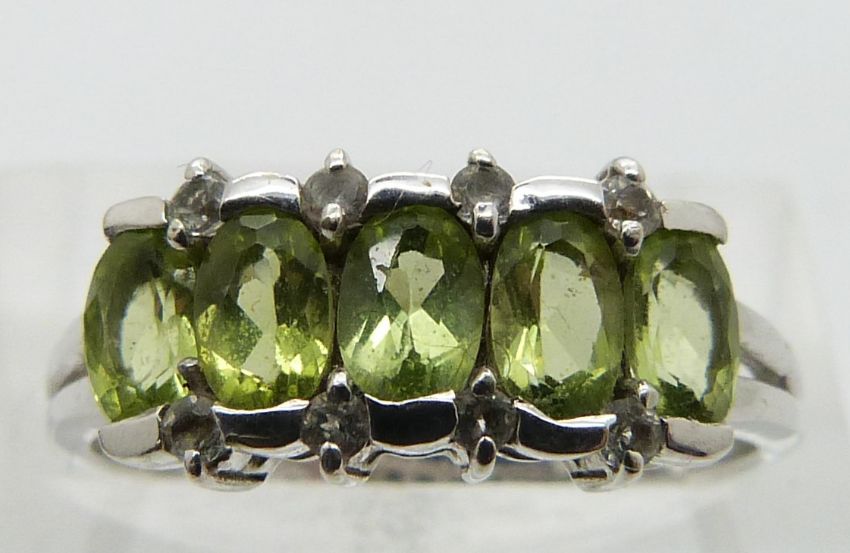 A 9ct white gold ring set with peridot and diamonds, size N