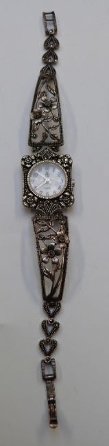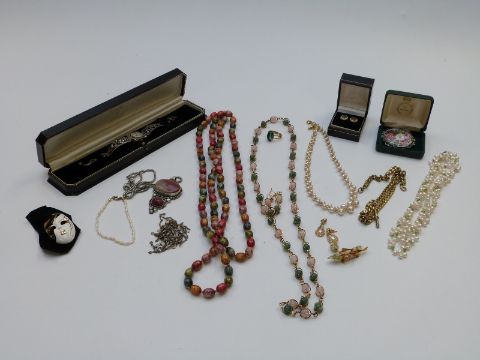 A collection of costume jewellery to include silver and marcasite watch, silver pendant, pearl necklace, brooches etc