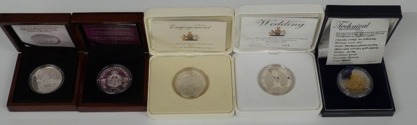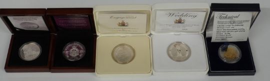 Five silver commemorative crowns / £5 coins including Engagement and Wedding of Prince William and Catherine Middleton, 2013 Christening of HRH Prince George, 2013 Coronation Britannia and a Tristan da Cunha £5 coin, all cased with certificates