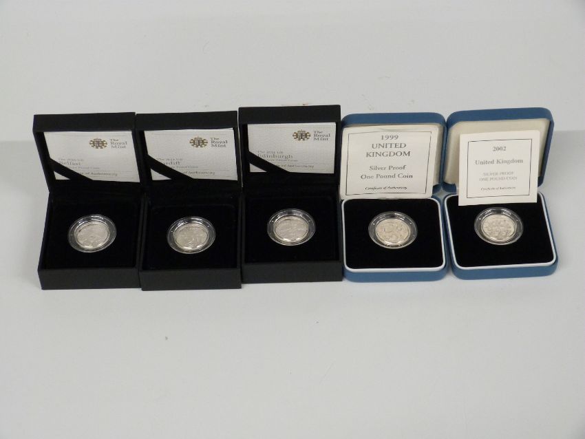 Five silver proof one pound coins including 1999, 2002, 2011 Edinburgh, 2011 Cardiff and 2010 Belfast, all cased with certificates