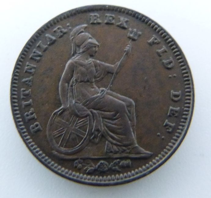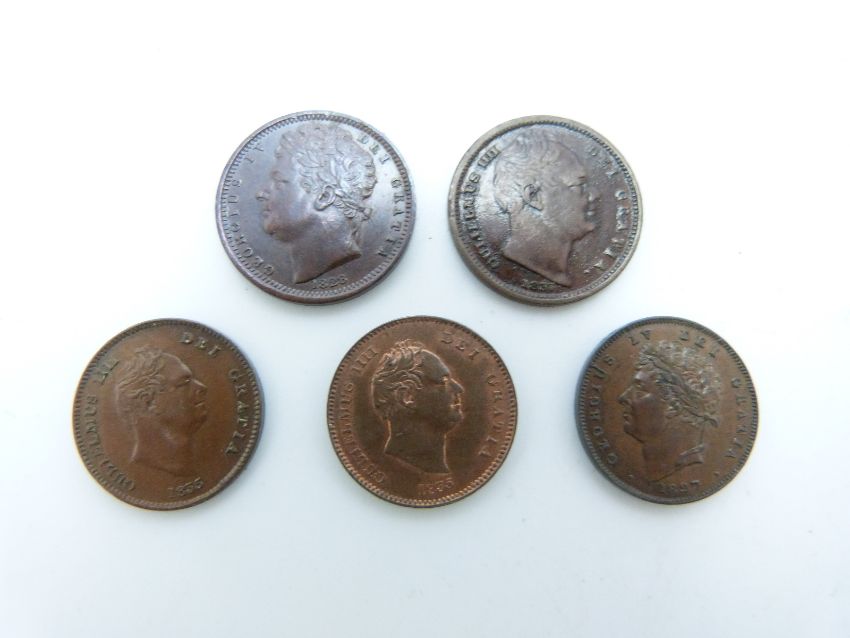 George IV and William IV copper third and half farthings 1827, 1828, NEF, 1835 EF with lustre and 1835 VF+, 1837 VF, five in all