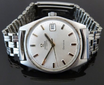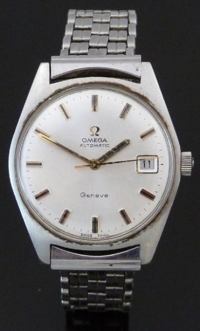 Omega automatic gentleman's automatic wristwatch ref. 166.041 with date aperture, two-tone gold and black hands and baton markers, silver face, stainless steel case and 24 jewel calibre 565 movement, on stainless steel bracelet, case diameter 34mm, serial number 27236670.