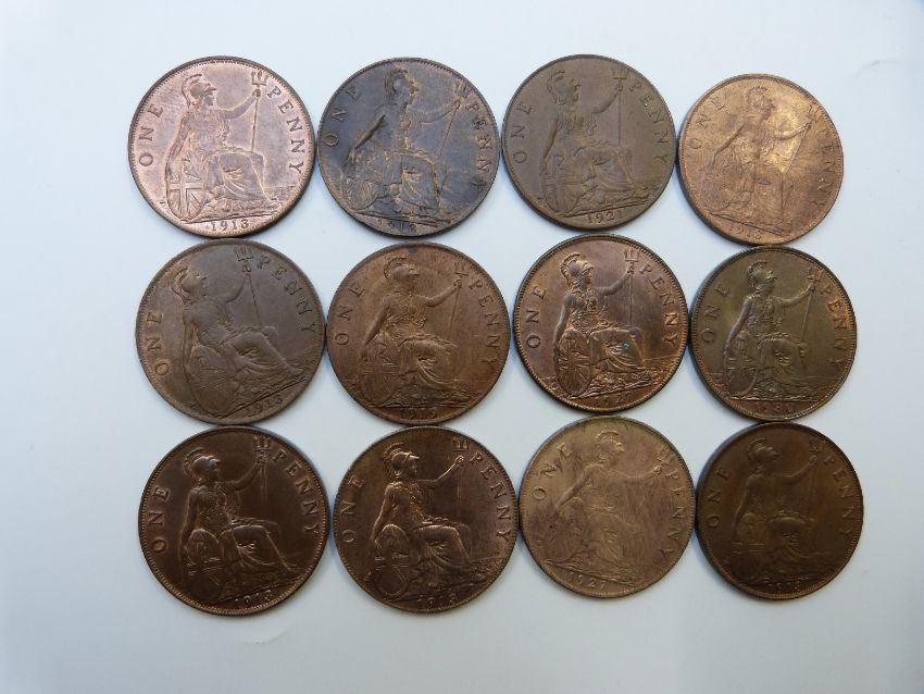 Twelve George V pennies, various years, 1913, 1919, 1921, 1927, all EF and with varying degrees of lustre