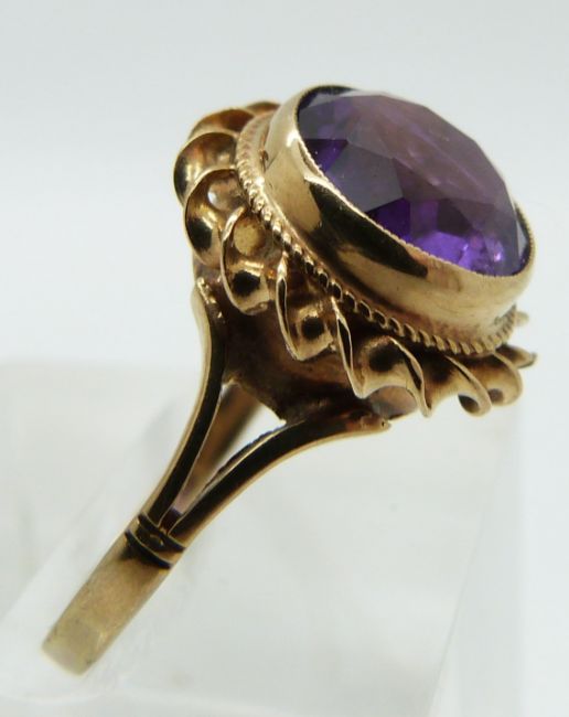 A 9ct gold ring set with a round cut amethyst with a twist border, size J