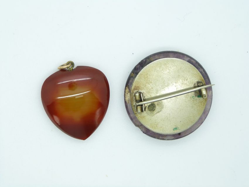 A Blue John brooch, 3.2cm diameter and an agate heart shaped pendant