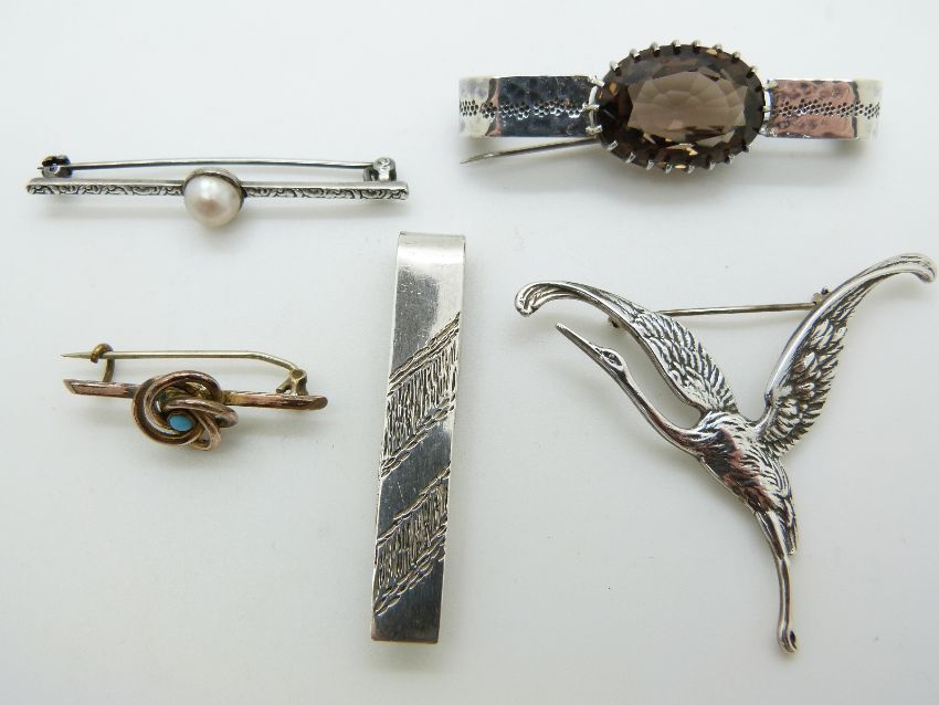A silver tie clip, Victorian knot brooch, silver crane brooch, a pearl brooch and a smoky quartz brooch