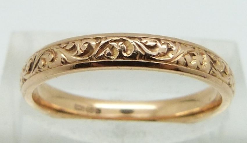 An 18ct gold wedding band with engraved decoration, 3.3g, size N