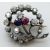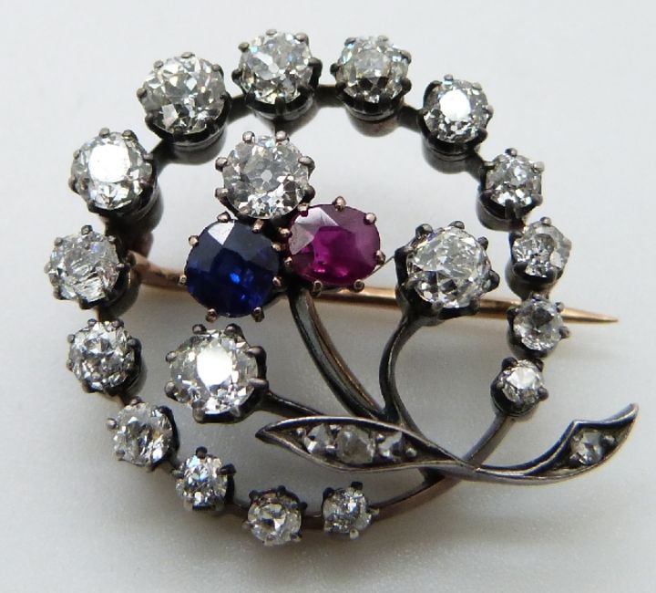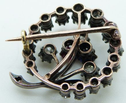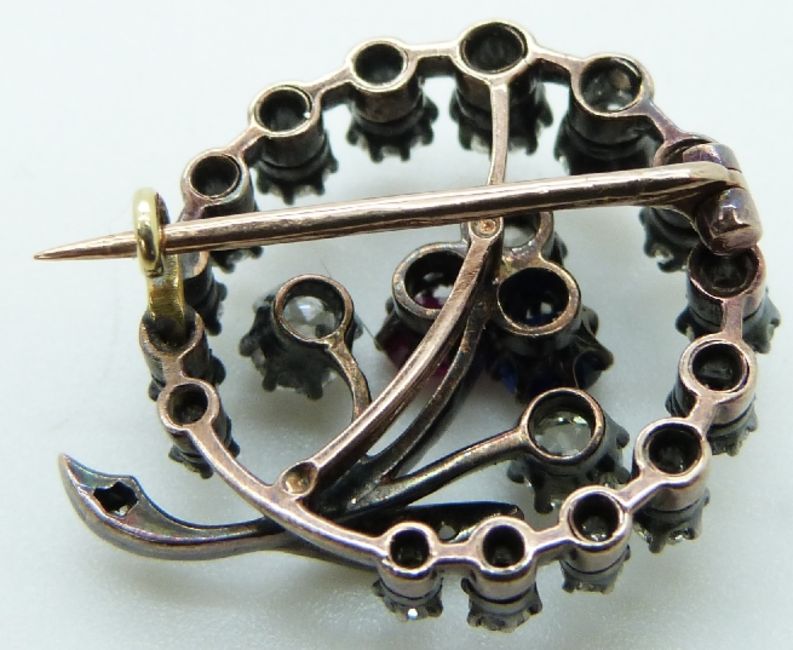 Victorian brooch in the form of a crescent with central flower set with old cut diamonds, the largest approximately 0.2ct, a sapphire and a ruby, 2cm diameter