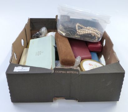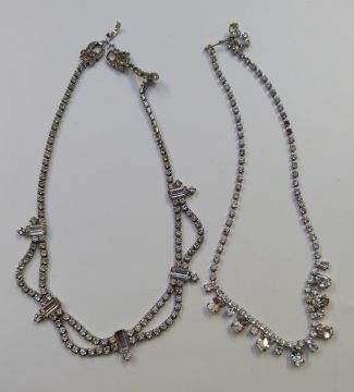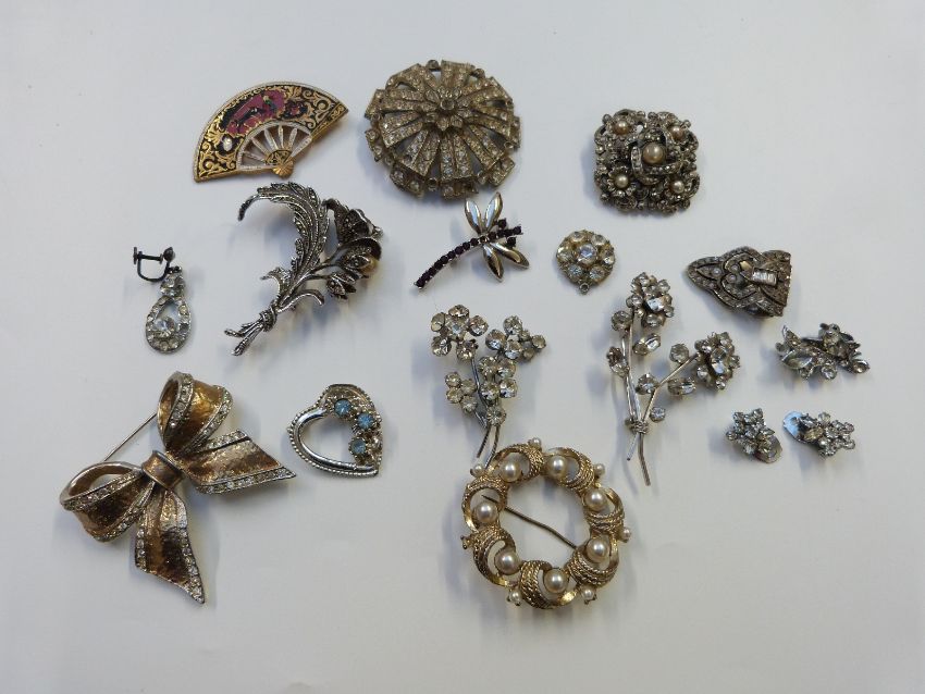 A collection of costume jewellery including diamanté necklaces, brooches, earrings, Ronson lighter, Art Deco necklace etc