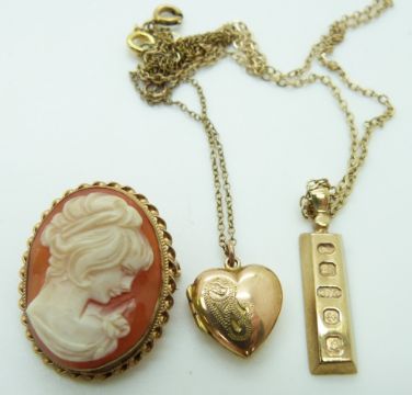 A 9ct gold ingot and 9ct gold chain (5.2g), a locket and a 9ct gold brooch set with a cameo