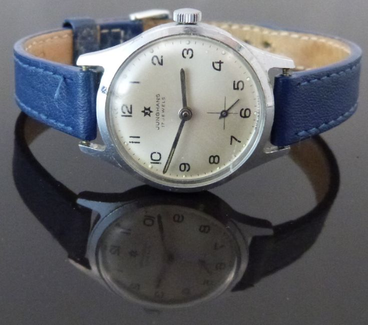 Junghans gentleman's wristwatch ref. 620.10 with subsidiary seconds dial, luminous steel hands and dot markers, black Arabic numerals, silver dial, stainless steel case and calibre J9 movement, on blue leather strap, case diameter 28mm.