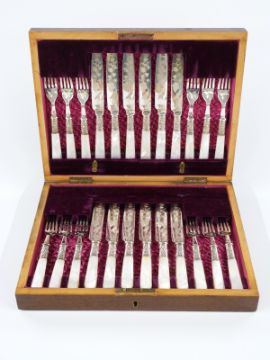 Cased set of mother of pearl handled hallmarked silver ferruled fruit knives and forks