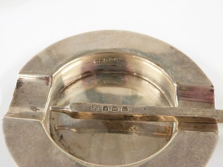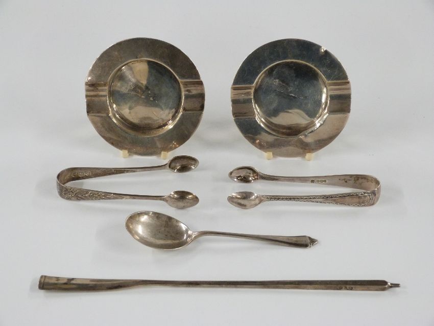 Hallmarked silver presentation oar, Birmingham 1938 maker Keen & Page, length 20.5cm, two hallmarked silver cigar ashtrays, sugar tongs etc, weight of silver 137g