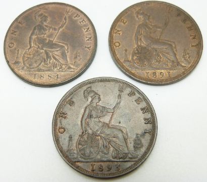 1884 Victorian later young bust bronze penny, OT TB, some lustre, VF+ together with an 1891 example VF-EF and an 1893 EF penny